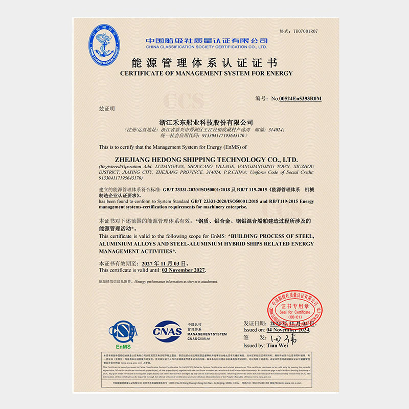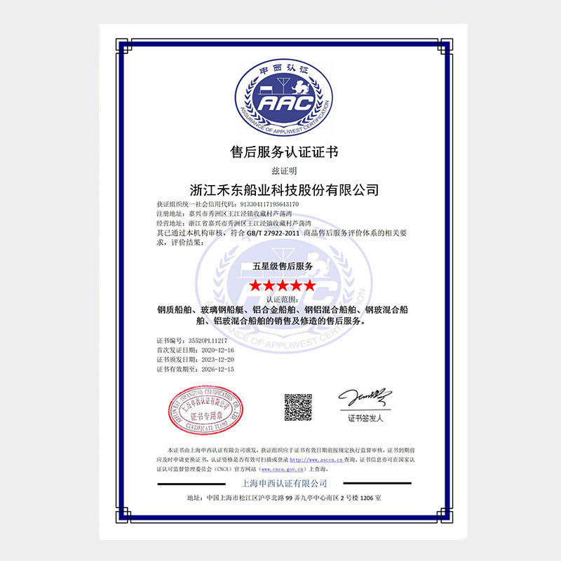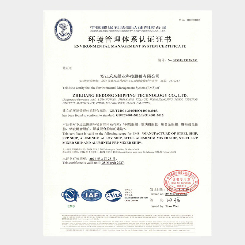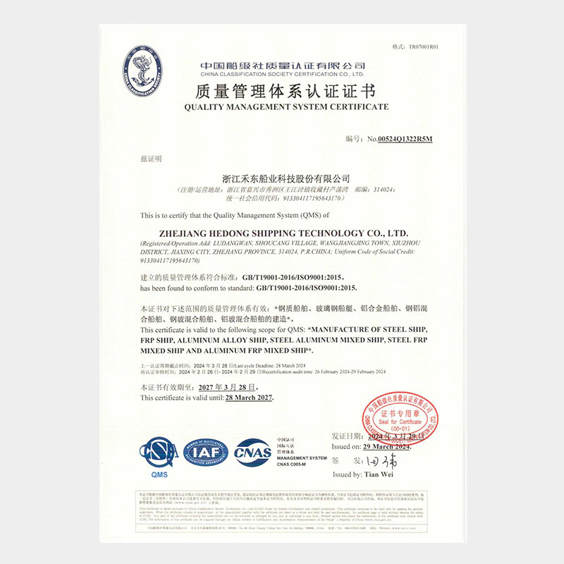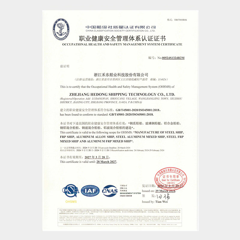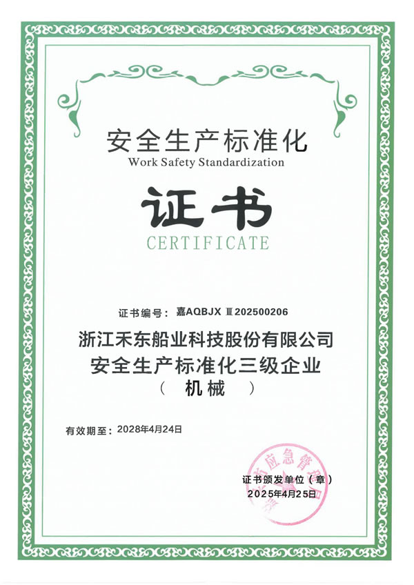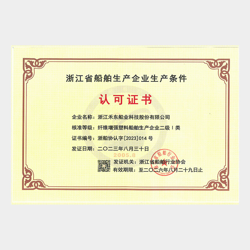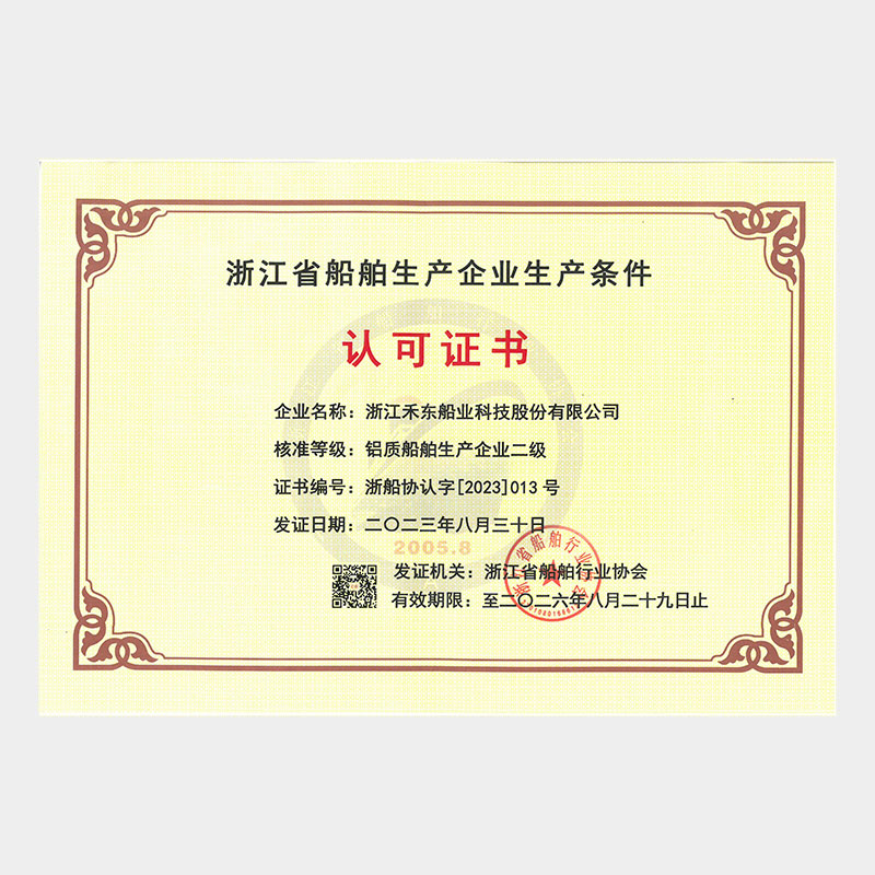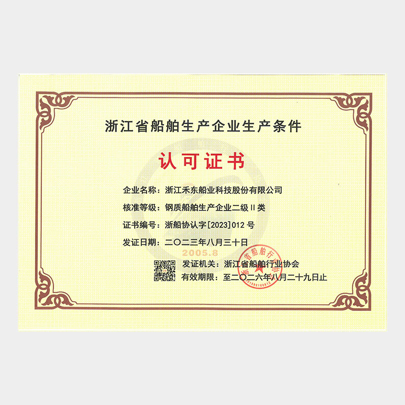 公司具備鋼質(zhì)船舶制造企業(yè)二級(jí)∥類(lèi)、鋁質(zhì)船舶制造企業(yè)三級(jí)和纖維增強(qiáng)塑料船舶制造企業(yè)二級(jí)類(lèi)資質(zhì),擁有中國(guó)船級(jí)社認(rèn)證公司認(rèn)證的IS09001質(zhì)量管理體系、ISO14001 環(huán)境管理體系認(rèn)證證書(shū)和OHSAS18001職業(yè)健康安全管理體系和按照國(guó)家相關(guān)標(biāo)準(zhǔn)建立的安全生產(chǎn)標(biāo)準(zhǔn)化三級(jí)體系。